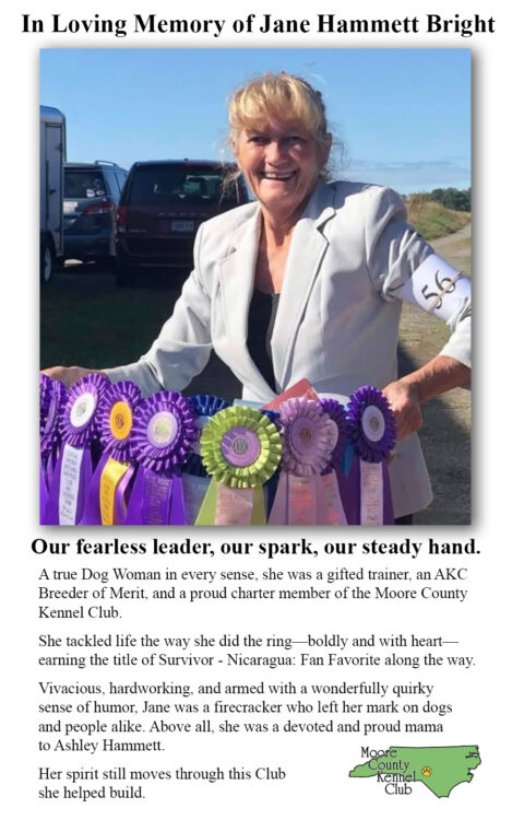 As we approach the one-year mark of her passing, we proudly dedicate this year’s dog show to Jane Hammett Bright. The tribute below honors the spirit, passion, and legacy she continues to inspire in our club.